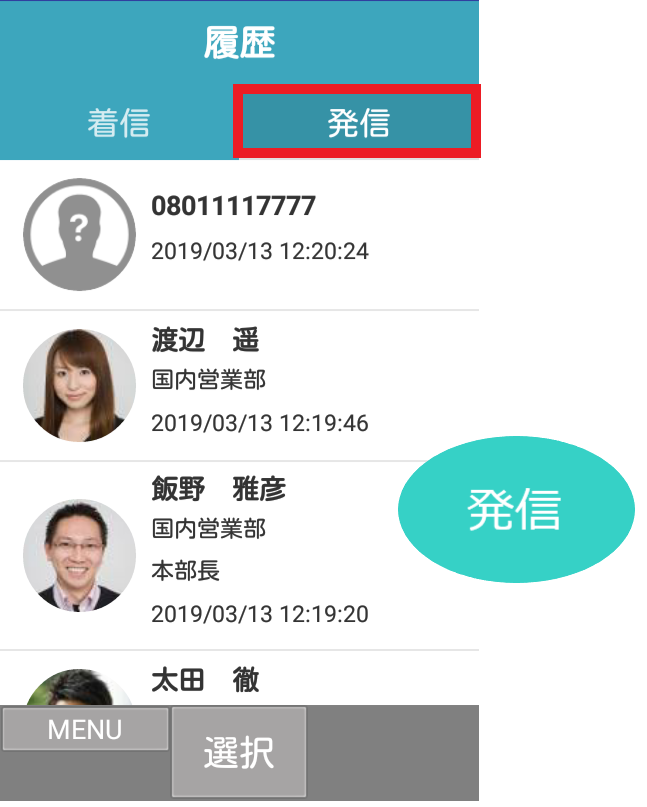 [履歴]タブを選択し、[着信]または[発信]を選択して、発着信画面を表示します。