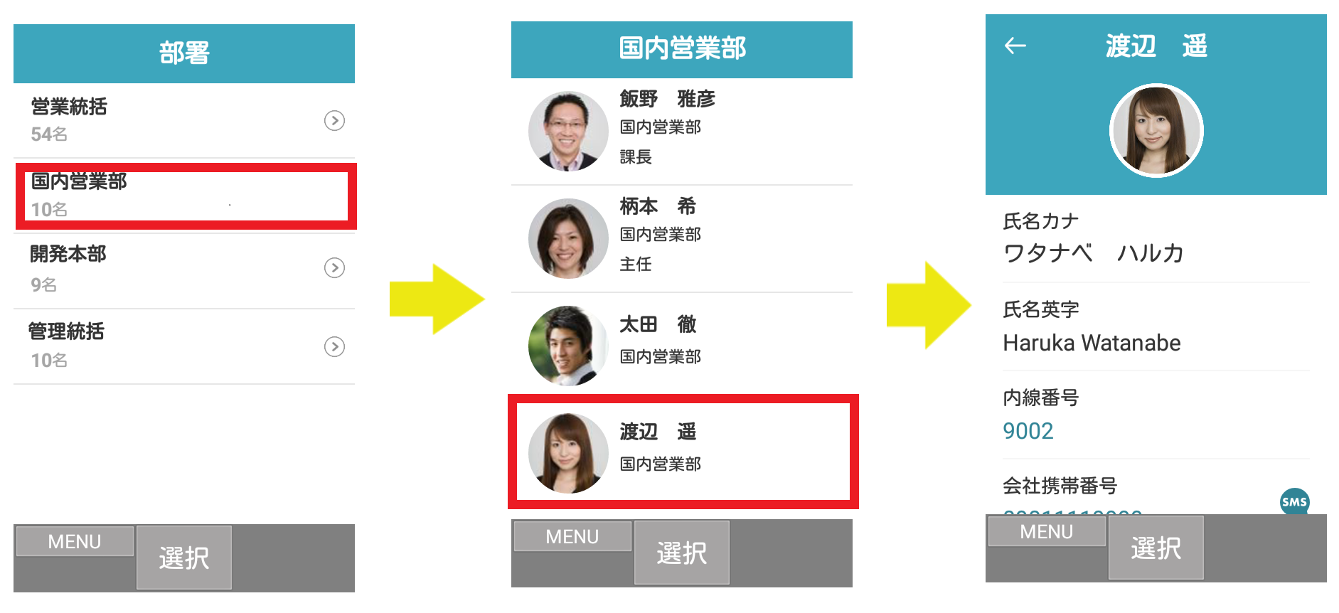 [電話帳]タブを選択すると電話帳が表示され、連絡先の閲覧・検索ができます。