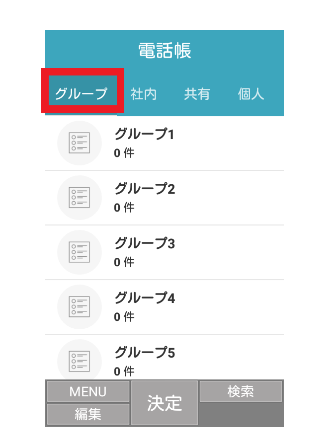 [電話帳]タブ>[グループ]タブを選択すると、グループ一覧が表示されます。