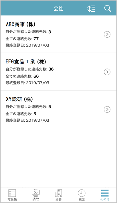 登録されている名刺データを元に会社ごとにグルーピングされて表示されます。