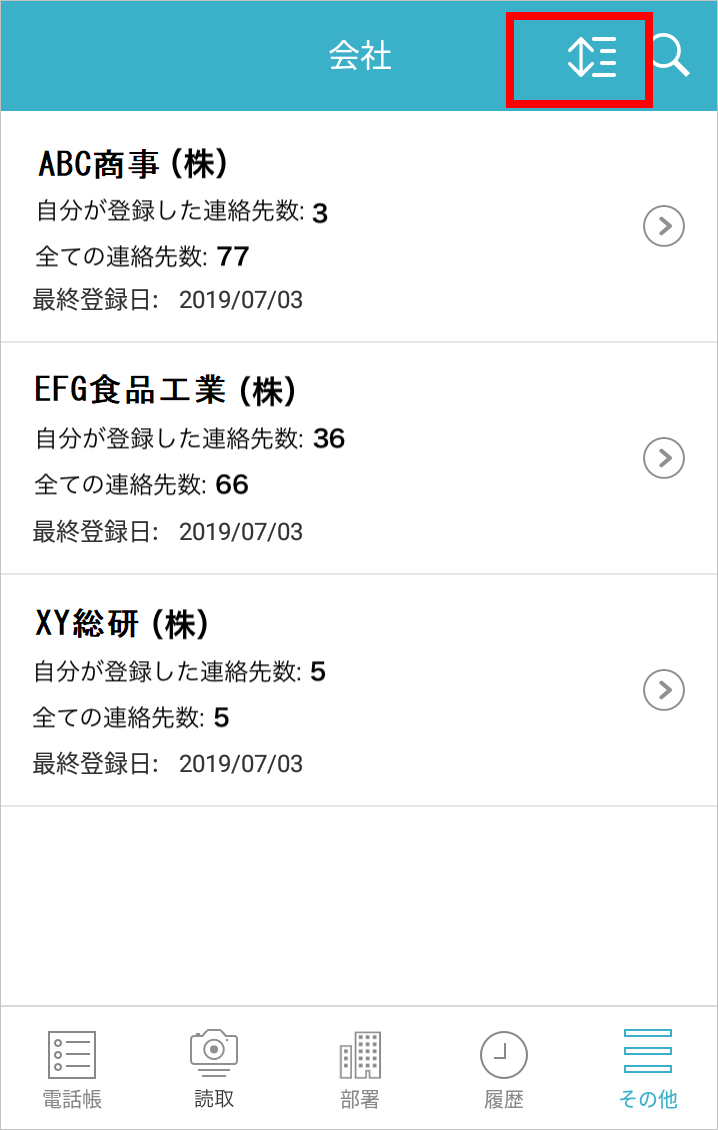 共有電話帳または個人電話帳より、自分が閲覧できるその会社の名刺の件数が表示されます。 |