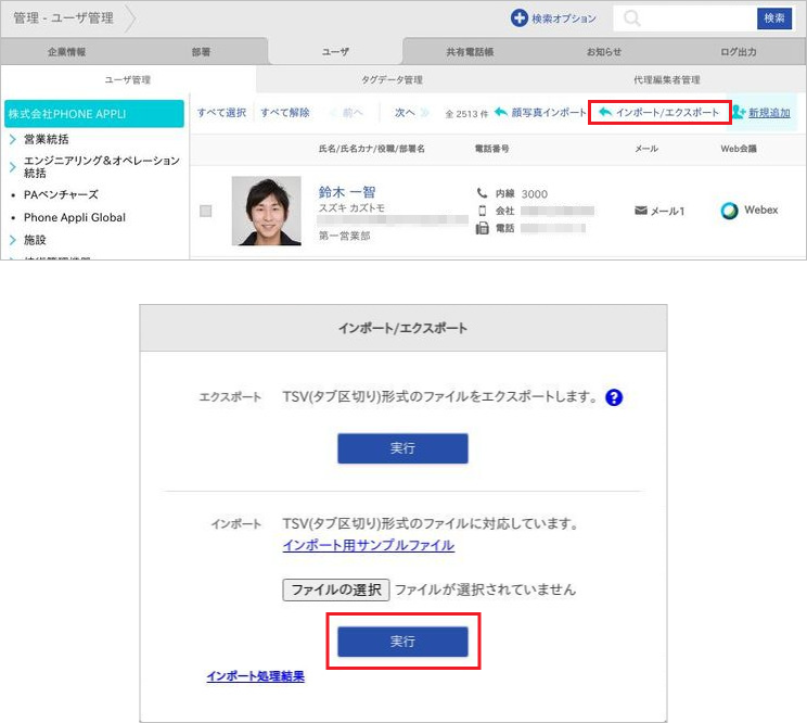 スマートフォンタブ 項目文言変更(電話帳アップロード/電話帳ダウンロード) |