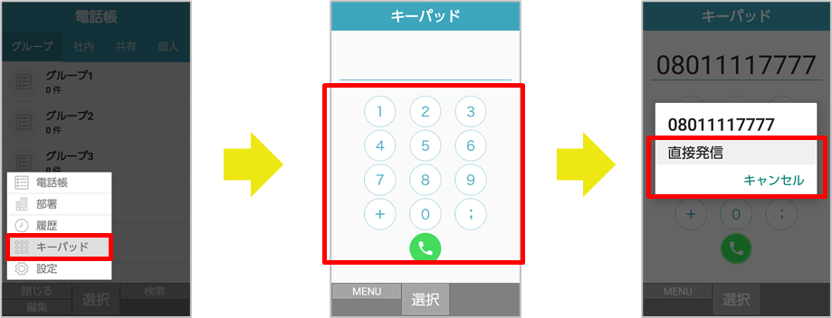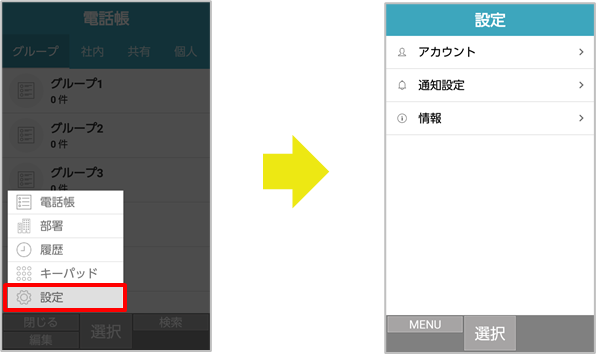 [電話帳]タブ>種別を選択して電話帳を表示し、連絡先の閲覧・検索ができます。