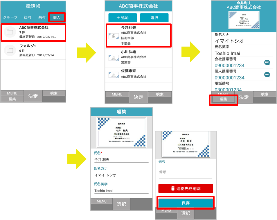 編集したい連絡先が登録された個人電話帳フォルダ>編集したい連絡先を選択します。