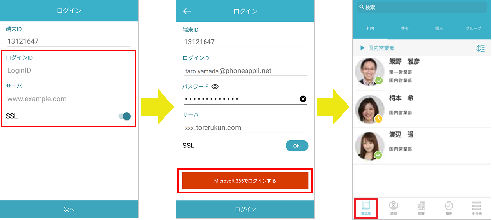 ログインが成功すると、電話帳タブが表示されます(電話帳タブが一番左に設定されている場合)。