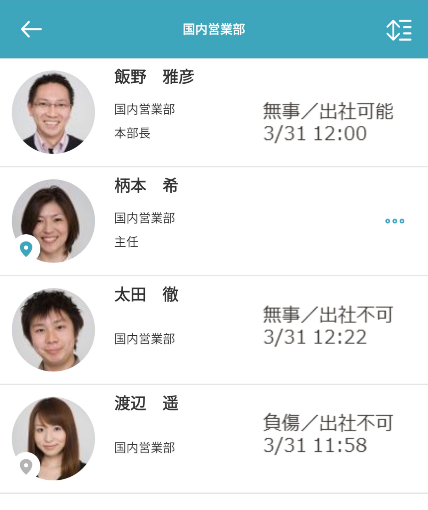 ユーザが安否状況を回答するとPA PEOPLEの「社内電話帳」や「グループ」に反映され、確認できます。