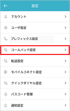 スマートフォンアプリでコールバック発信を行う場合、設定のコールバック設定にてコールバック番号を登録します。