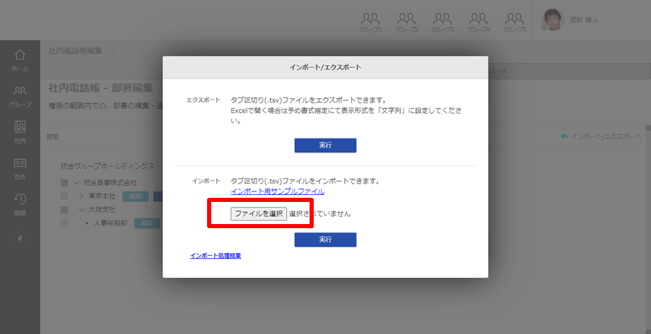 TSV(タブ区切り)形式のファイルを用いて、編集管理者に設定された管理範囲内の部署および、ユーザの追加・編集・削除ができます。 |
