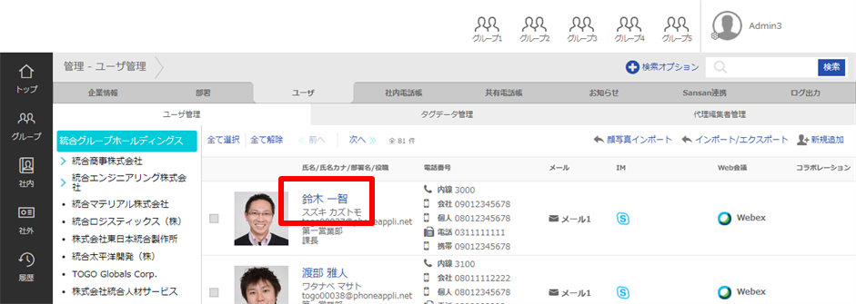 画面右上のユーザ名をクリックし、[社内電話帳編集]>[ユーザ]タブをクリックします。
