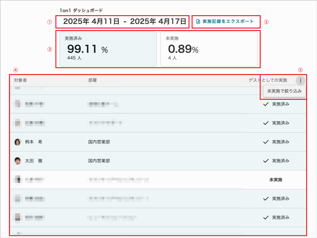 1on1ダッシュボードでは、組織全体の1on1実施状況を管理できます(「組織全体の1on1実施状況を管理する」)。