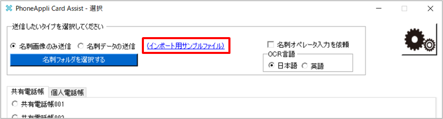 CSVファイルおよび画像(*.jpg)を名刺データとして送信できます。